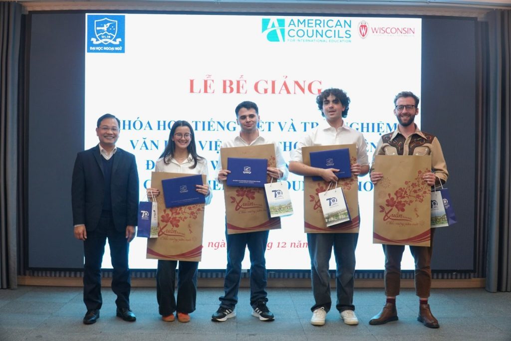 On December 5, 2025, the University of Languages and International Studies – Vietnam National University, Hanoi (ULIS-VNU) held the Closing Ceremony of the Vietnamese Language and Vietnamese Cultural Experience Course for students from the University of Wisconsin–Madison and the American Councils for International Education. The event took place on the first floor of the Sunwah Building in a warm and formal atmosphere, marking the conclusion of a 15-week journey of language learning and cultural exploration for international students at ULIS.
