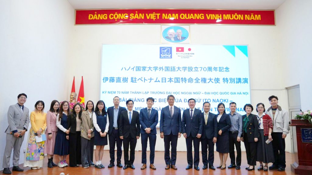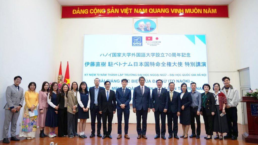 On December 16, 2025, at Vu Dinh Lien Hall, Mr. Ito Naoki, Ambassador Extraordinary and Plenipotentiary of Japan to Vietnam, delivered a special lecture to students of ULIS and pupils of the Foreign Language Specialized School (FLSS). The event also featured the presentation of Certificates of Commendation from the Head of the Japanese Diplomatic Mission Abroad to ULIS and FLSS.