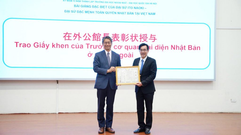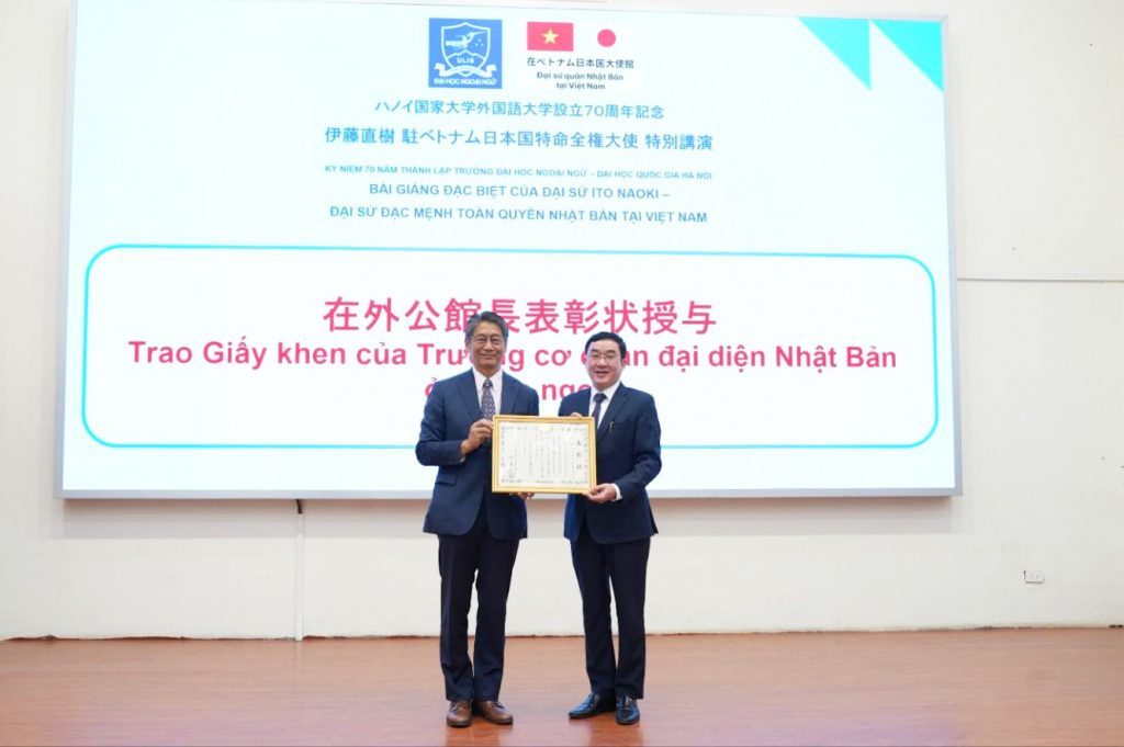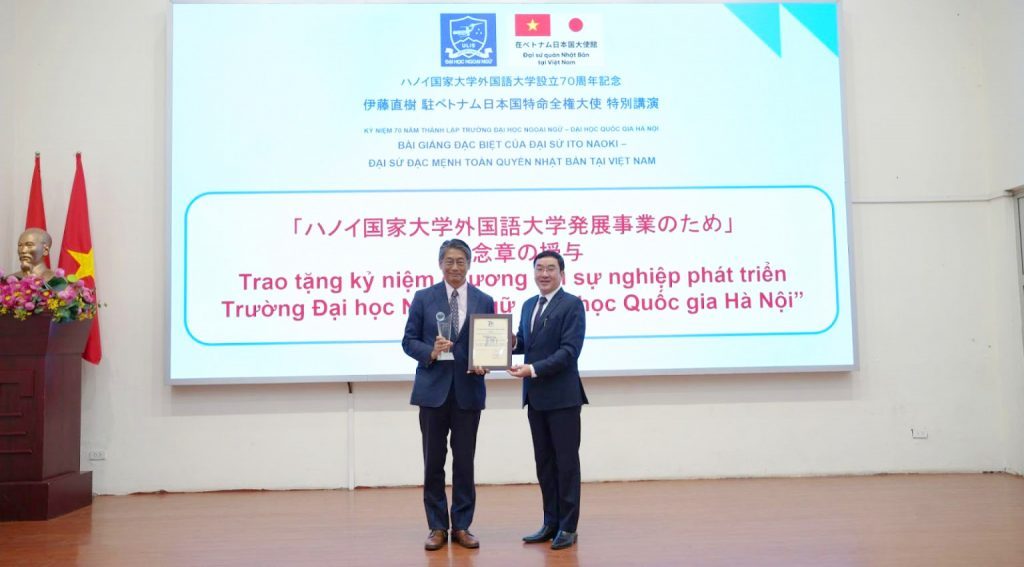On the same occasion, ULIS–VNU awarded the Commemorative Medal “For the Development of the University of Languages and International Studies – Vietnam National University, Hanoi” to Ambassador Ito Naoki in recognition of his active contributions to the University’s development, on the occasion of its 70th anniversary.