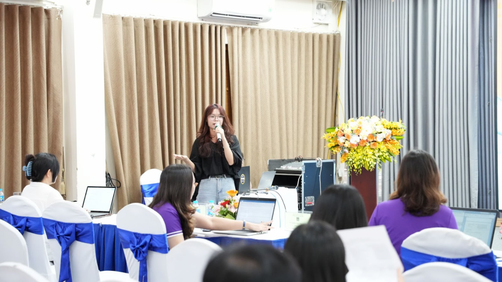 The Dean of the Faculty of English Language and Culture Vu Thi Thanh Nha also gave a presentation titled “The use of AI tools in assessing English in Vietnam: Opportunities and Challenges”. According to the speaker, AI can assist in giving responses or feedback immediately for each individual, thereby helping data analysis or even reducing stress for students when taking English language proficiency tests. There are drawbacks, however, when using AI in providing in-depth comments or recommendations for students, and the excessive dependence on practicing or taking tests. Dr. Vu Thi Thanh Nha supposed that the collaboration between AI and humans can lead to outcomes that surpass human capabilities.