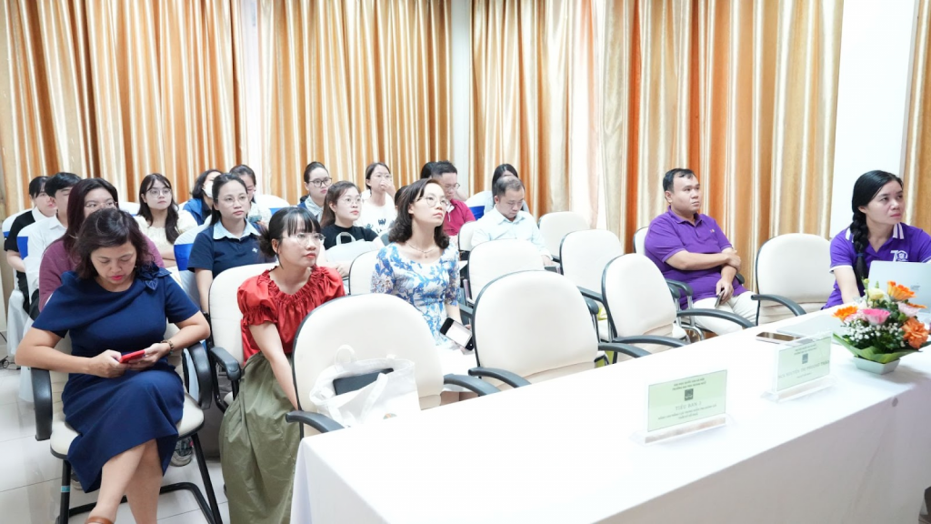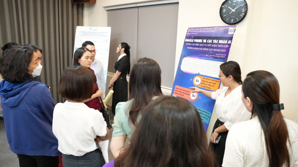 The Dean of the Faculty of English Language and Culture Vu Thi Thanh Nha also gave a presentation titled “The use of AI tools in assessing English in Vietnam: Opportunities and Challenges”. According to the speaker, AI can assist in giving responses or feedback immediately for each individual, thereby helping data analysis or even reducing stress for students when taking English language proficiency tests. There are drawbacks, however, when using AI in providing in-depth comments or recommendations for students, and the excessive dependence on practicing or taking tests. Dr. Vu Thi Thanh Nha supposed that the collaboration between AI and humans can lead to outcomes that surpass human capabilities.